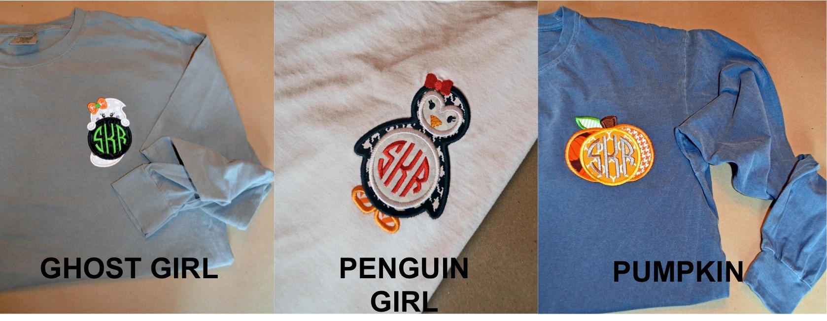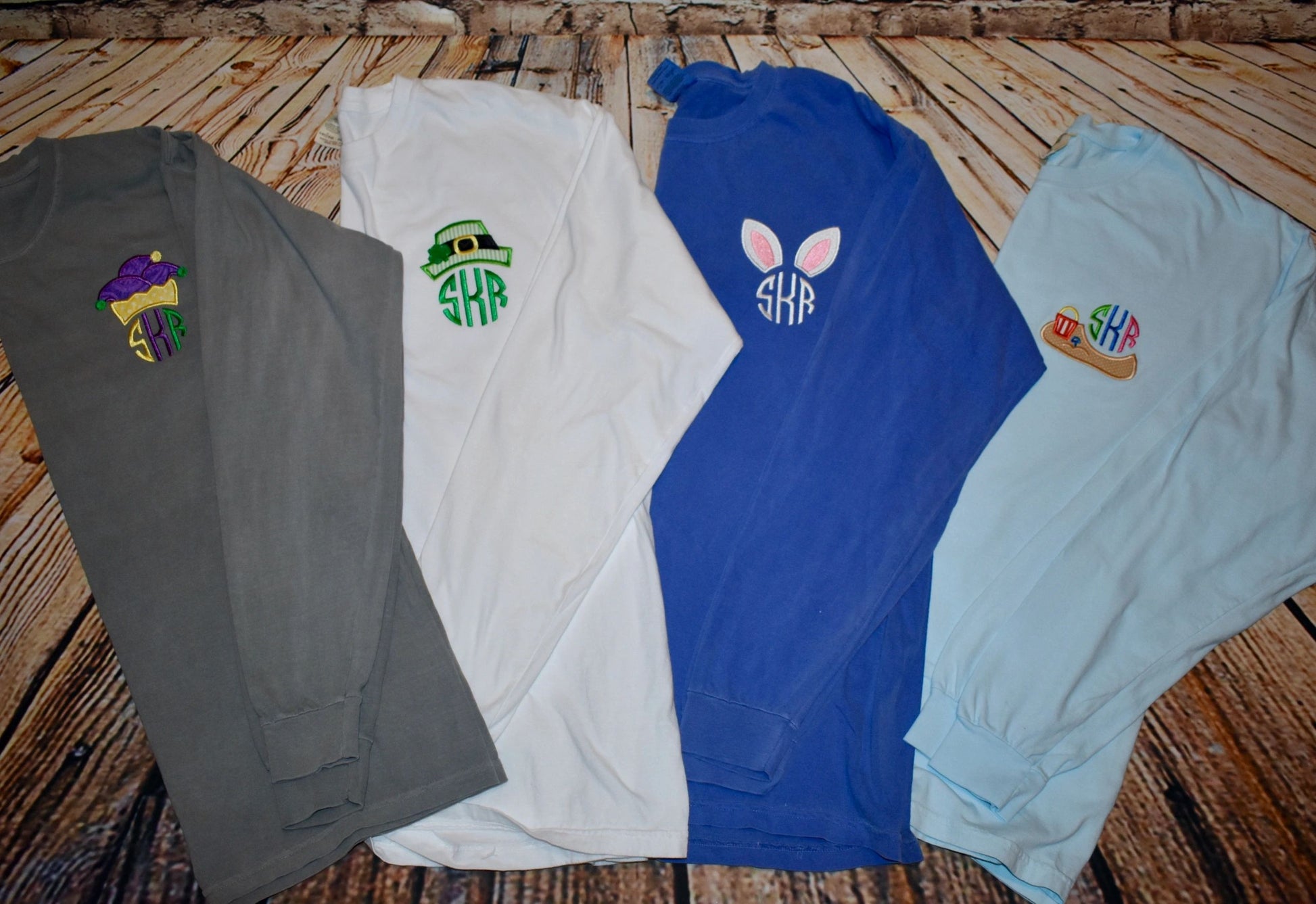 - Please select desired shirt size, holiday design and monogram embroidery thread color as well as specify the desired monogram initials before checkout. Also, please specify any special requests in your order notes prior to checkout. We will do our best to comply.
