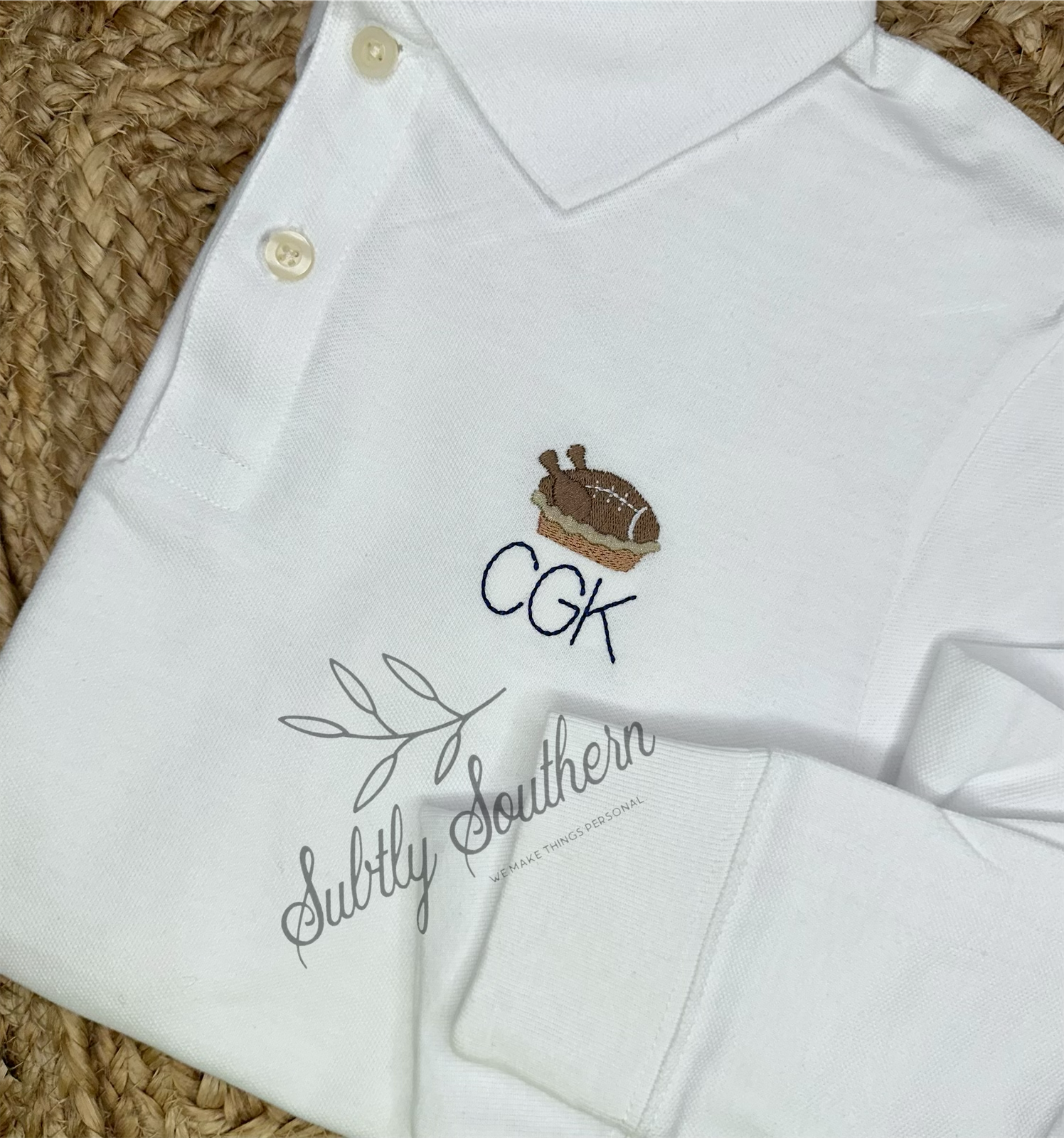 When ordering an embroidered item, please specify your monogram initials or name, monogram font & thread color. All of the monogram options can be found here.